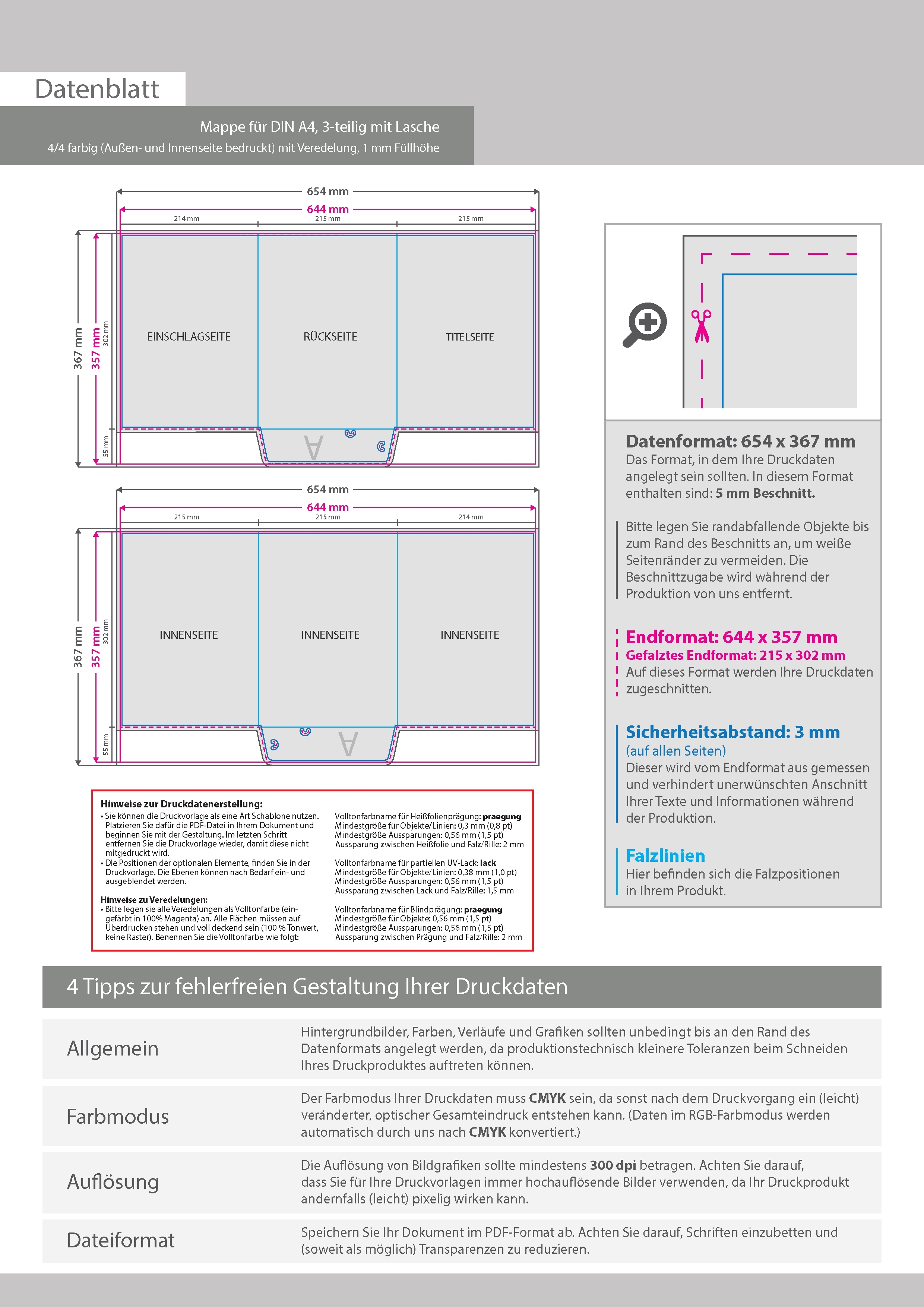 Mappe für DIN A4, 3-teilig mit Lasche, 4/4 farbig (Außen- und Innenseite bedruckt), mit partieller UV-Lack-Veredelung